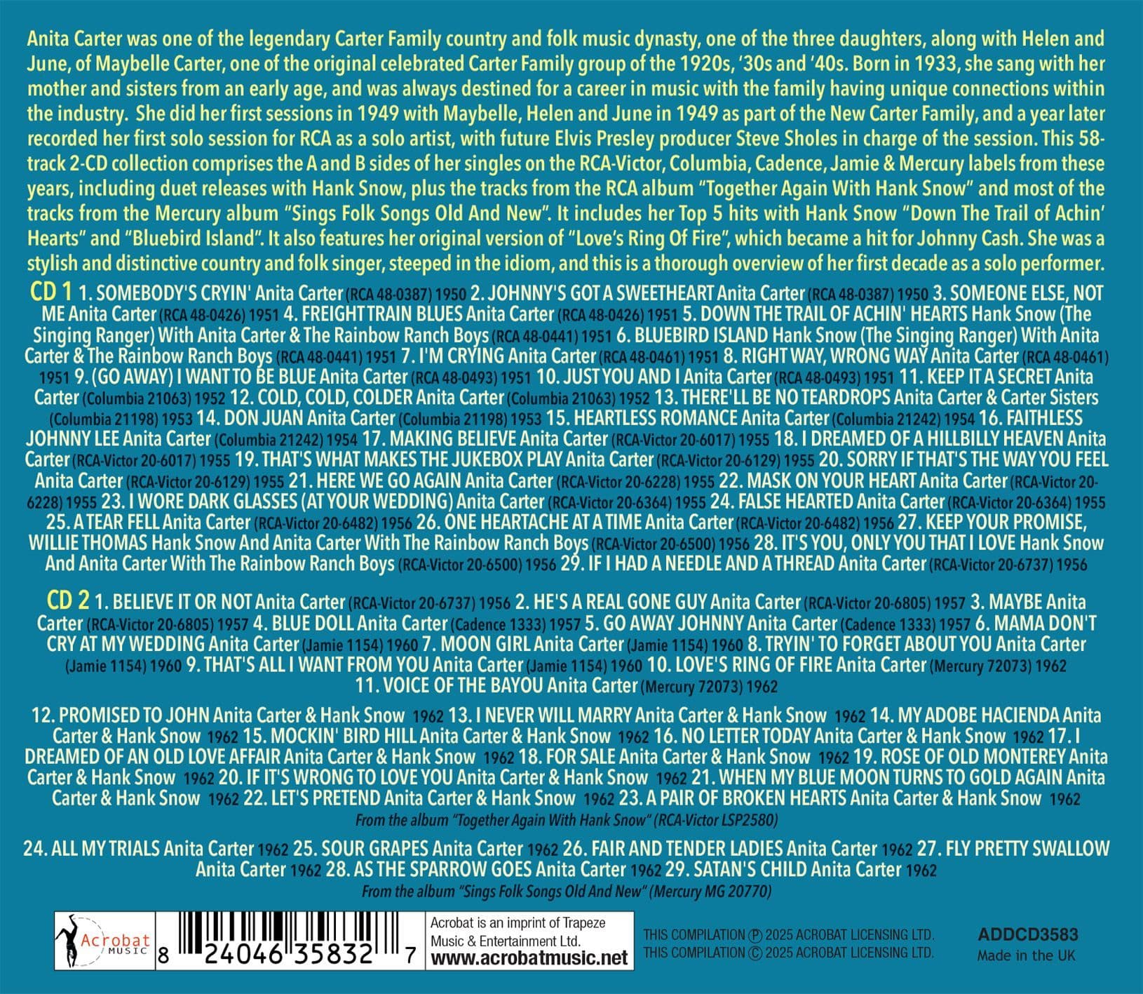 This 58-track 2-CD collection comprises the A and B sides of her singles on the RCA-Victor, Columbia, Cadence, Jamie & Mercury labels from these years, including duet releases with Hank Snow, plus the tracks from the RCA album “Together Again With Hank Snow” and most of the tracks from the Mercury album “Sings Folk Songs Old And New”. It includes her Top 5 hits with Hank Snow “Down The Trail of Achin’ Hearts” and “Bluebird Island”. It also features her original version of “Love’s Ring Of Fire”, which became a hit for Johnny Cash.