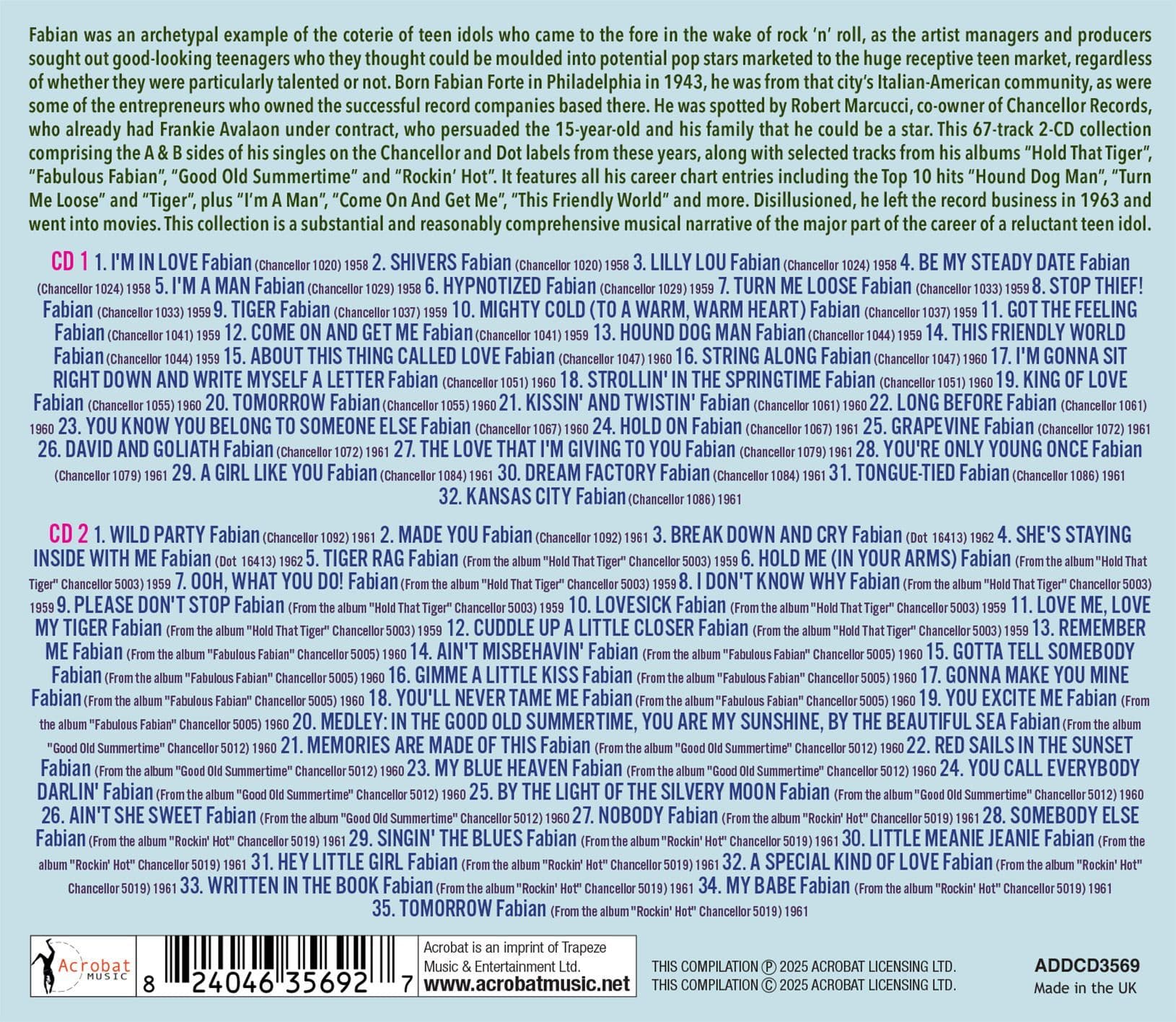 This 67-track 2-CD collection comprising the A & B sides of his singles on the Chancellor and Dot labels from these years, along with selected tracks from his albums “Hold That Tiger”, “Fabulous Fabian”, “Good Old Summertime” and “Rockin’ Hot”. It features all his career chart entries including the Top 10 hits “Hound Dog Man”, “Turn Me Loose” and “Tiger”, plus “I’m A Man”, “Come On And Get Me”, “This Friendly World” and more.