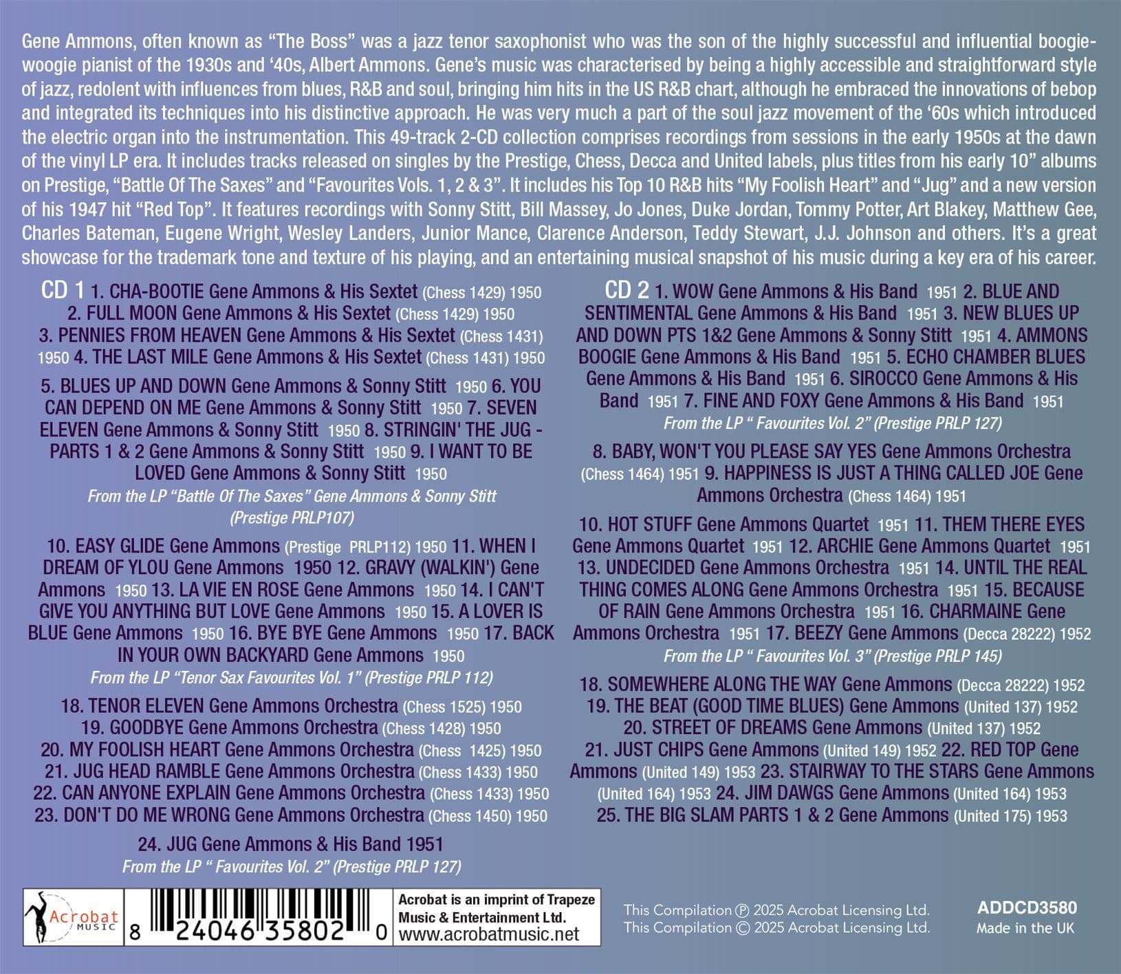 This 49-track 2-CD collection comprises recordings from sessions in the early 1950s at the dawn of the vinyl LP era. It includes tracks released on singles by the Prestige, Chess, Decca and United labels, plus titles from his early 10” albums on Prestige, “Battle Of The Saxes” and “Favourites Vols. 1, 2 & 3”. It includes his Top 10 R&B hits “My Foolish Heart” and “Jug” and a new version of his 1947 hit “Red Top”. It features recordings with Sonny Stitt, Bill Massey, Jo Jones, Duke Jordan, Tommy Potter, Art Blakey, Matthew Gee, Charles Bateman, Eugene Wright, Wesley Landers, Junior Mance, Clarence Anderson, Teddy Stewart, J.J. Johnson and others.