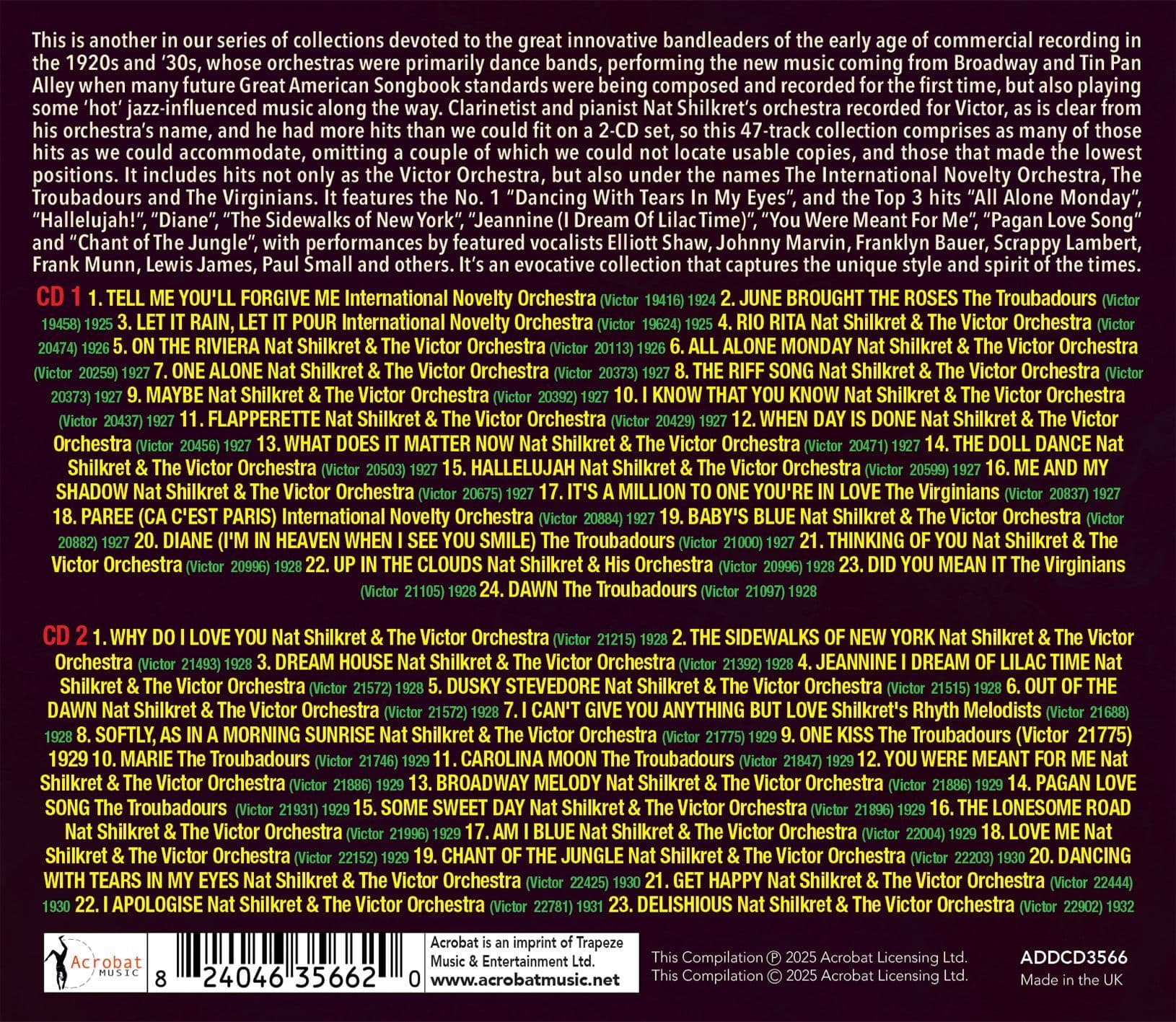 Clarinetist and pianist Nat Shilkret’s orchestra recorded for Victor, as is clear from his orchestra’s name, and he had more hits than we could fit on a 2-CD set, so this 47-track collection comprises as many of those hits as we could accommodate, omitting a couple of which we could not locate usable copies, and those that made the lowest positions.