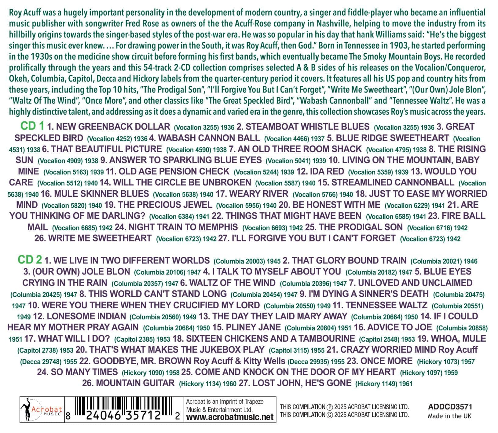 Roy Acuff was a hugely important personality in the development of modern country, a singer and fiddle-player who became an influential music publisher with songwriter Fred Rose as owners of the the Acuff-Rose company in Nashville, helping to move the industry from its hillbilly origins towards the singer-based styles of the post-war era. He was so popular in his day that Hank Williams said: “He's the biggest singer this music ever knew. … For drawing power in the South, it was Roy Acuff, then God.”