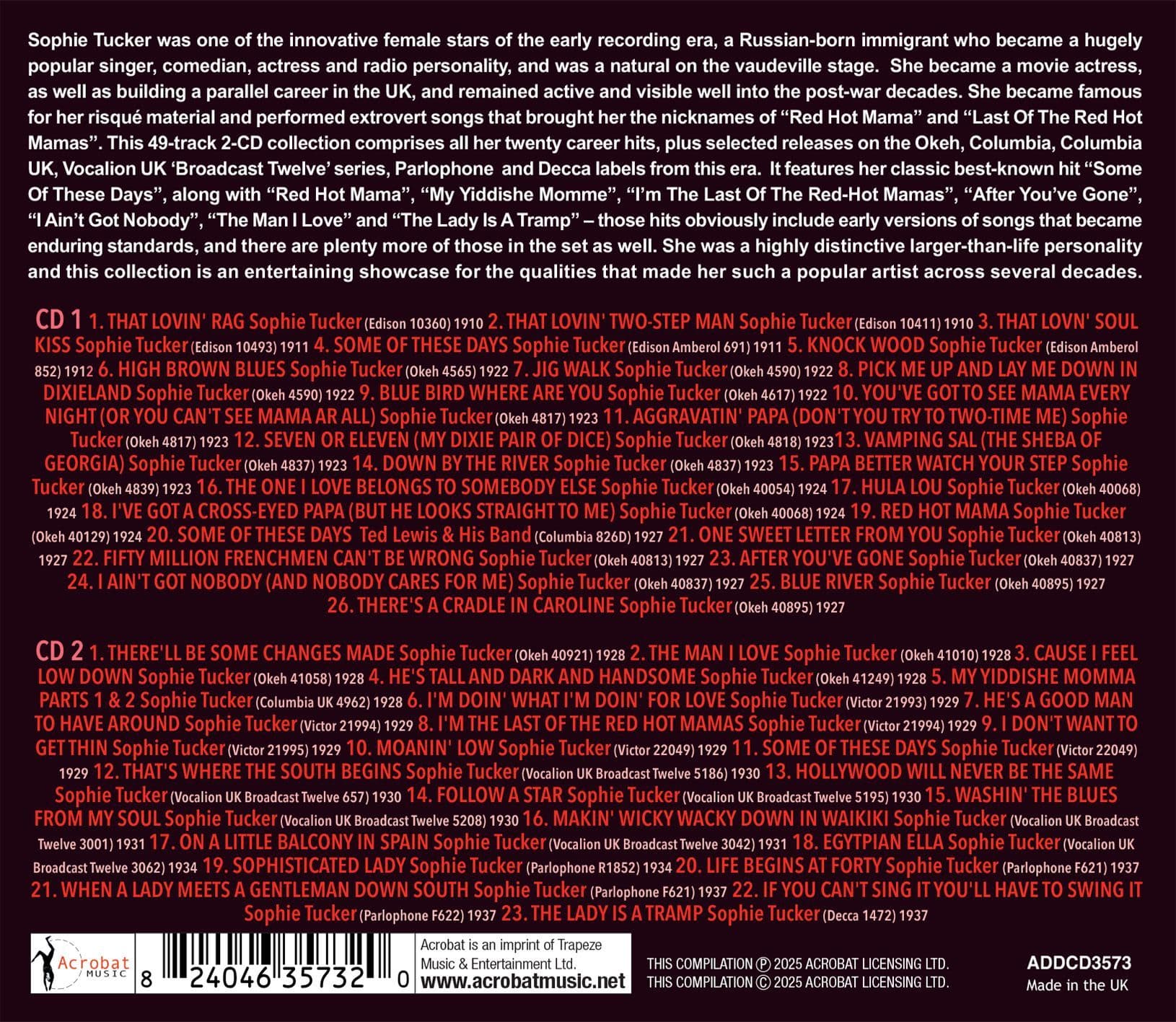 This 49-track 2-CD collection comprises all her twenty career hits, plus selected releases on the Okeh, Columbia, Columbia UK, Vocalion UK ‘Broadcast Twelve’ series, Parlophone and Decca labels from this era. It features her classic best-known hit “Some Of These Days”, along with “Red Hot Mama”, “My Yiddishe Momme”, “I’m The Last Of The Red-Hot Mamas”, “After You’ve Gone”, “I Ain’t Got Nobody”, “The Man I Love” and “The Lady Is A Tramp” – those hits obviously include early versions of songs that became enduring standards, and there are plenty more of those in the set as well.